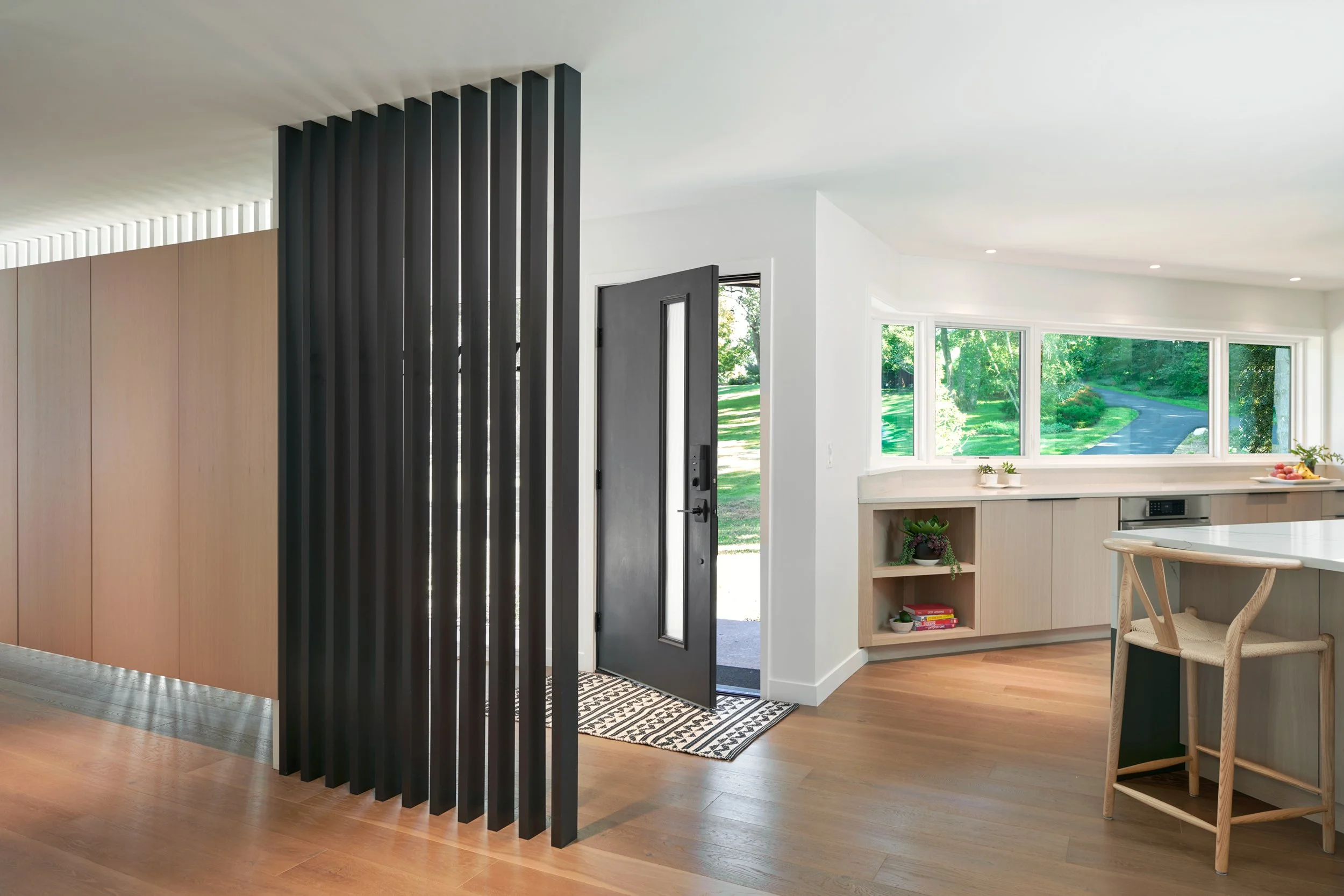 Refreshing this pristine midcentury (1959) residence found us removing a large fireplace to permit unobstructed views of nearby marshes. We also replaced the roof and reconstructed the front entry, and added new windows throughout the home, new floors, a new entry door and a sleek exterior color update.